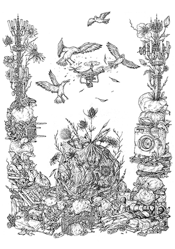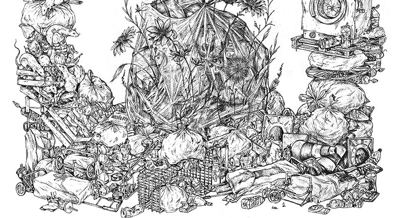La démarche n’embellit pas un rapport outrancier à l’accumulation et la consommation, mais apporte à ces problématiques une nouvelle expression. Sa technique intrigue, par le temps long souvent opposé aux injonctions logistiques de l’art urbain. Le noir et blanc permet l’amoncellement dans ces compositions sans alourdir, laissant l’espace aux détails, aux plis.