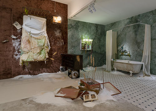 Bianca Bondi (née en 1986 à Johannesburg, Afrique du Sud – vit et travaille à Paris) occupe un espace délimité, où les mondes semblent avoir des possibles multiples. La marque du temps est tangible, son passage inéluctable palpable, se déployant par les réactions chimiques. Son installation immersive in situ, Silent House, interroge nos lieux de refuge dans un contexte mondial de crises, où la résilience semble poétiquement incarner un futur imaginable. La surface de nos objets quotidiens est marquée par le sel puis l’oxydation, créant un univers minéral. L’intérieur fragmenté, celui de nos écosystèmes, celui de nos intimités, est mis au cœur d’un potentiel de mutation.