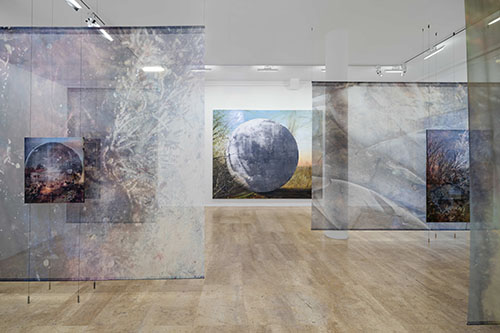 Le parcours se poursuit par les œuvres de l’artiste Eva Nielsen (née en 1983 aux Lilas, France – vit et travaille à Paris). L’artiste, par une superposition picturale, relevant de la photographie, de la peinture, de la sérigraphie, cherchant dans le latex, le cuir et la soie, donne à voir les strates géologiques des paysages arpentés. Son travail résonne par ce qui nous environne. Tant dans son exploration géographique que dans celle mémorielle, dans une opacité maîtrisée, l’artiste offre une lecture mouvante, insaisissable.